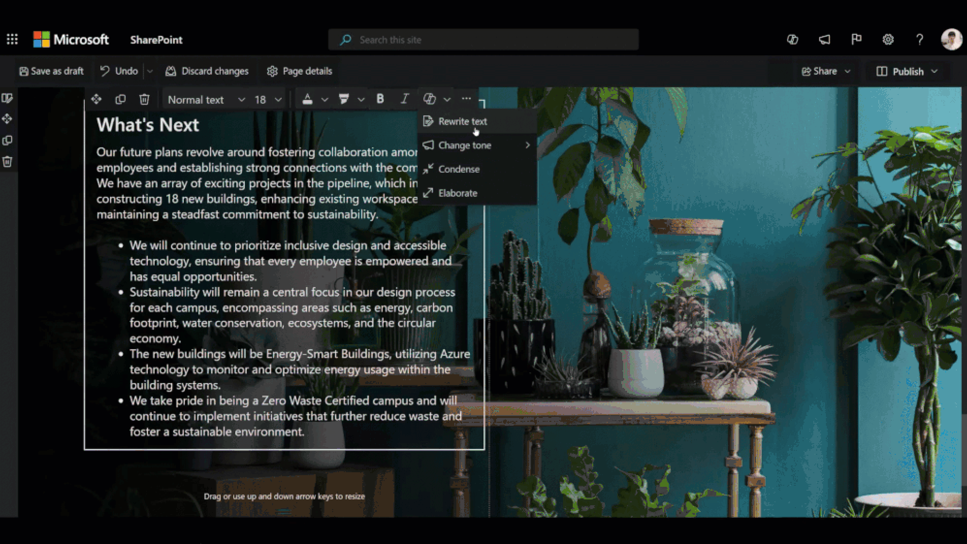Give your content authors access to the latest generative AI tools from Microsoft from right within your SharePoint page. Authors can update existing text on a SharePoint page by asking Copilot to rewrite the content, choosing to change the tone, summarise or expand on the content, or provide a complete re-write.