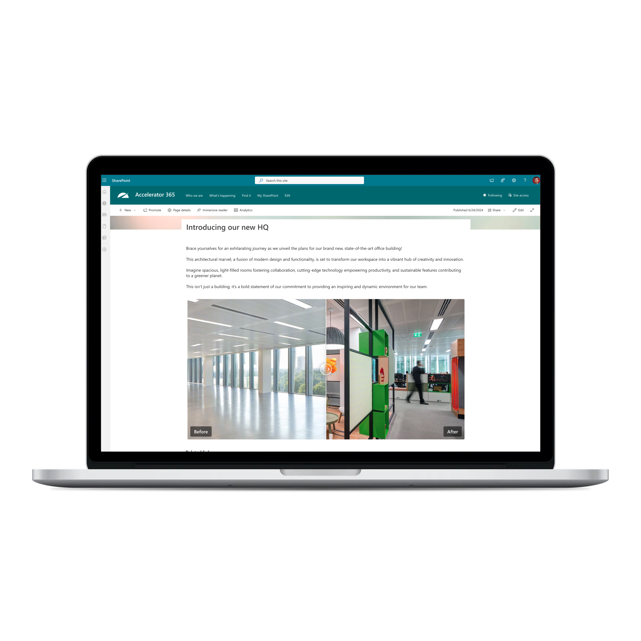The Before and After web part from Accelerator 365 empowers your content authors to integrate an intuitive image comparison tool into your SharePoint pages.