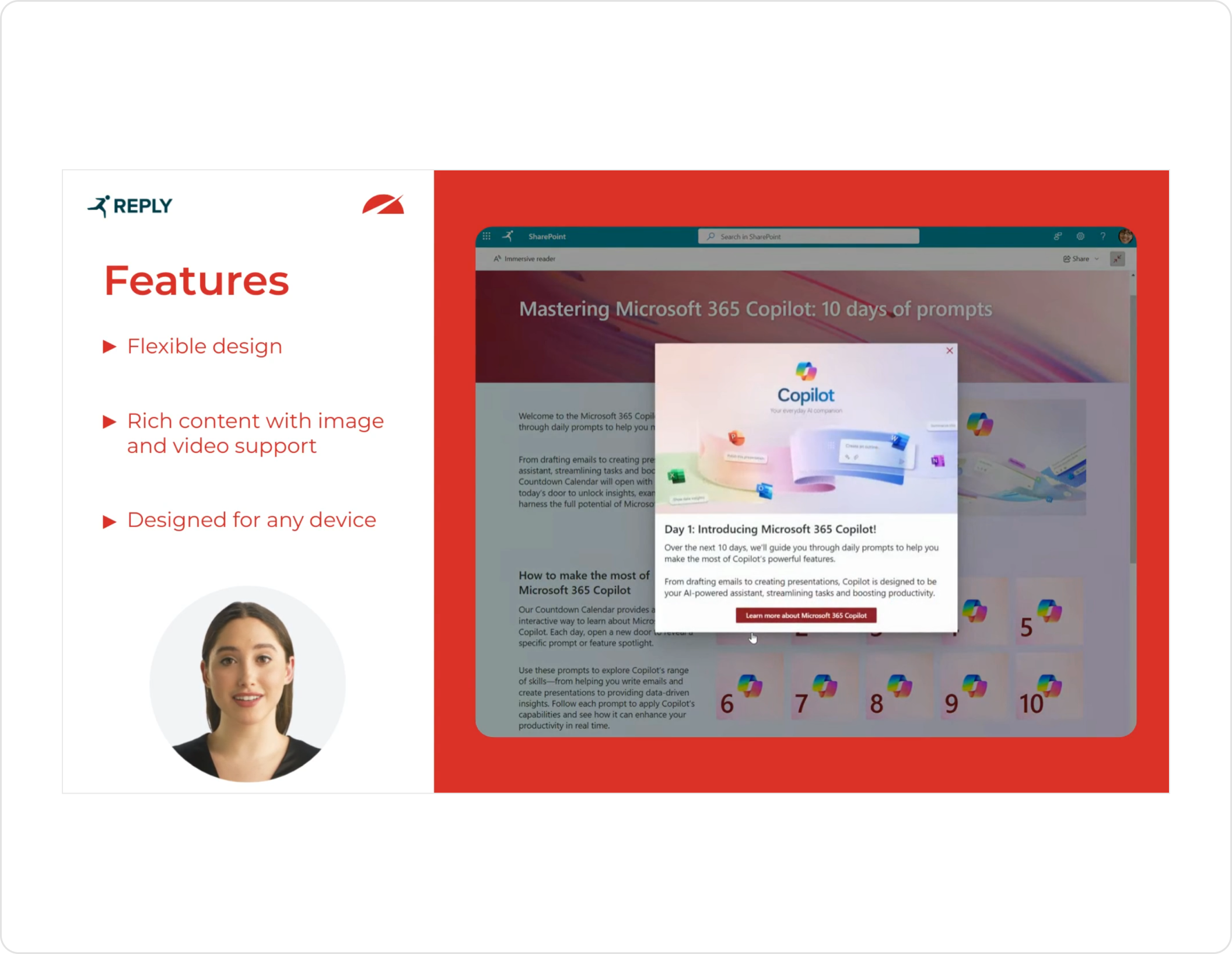 The Countdown Calendar web part from Accelerator 365 is designed to spotlight your most important campaigns and initiatives. Create excitement and anticipation by counting down the days with your users, while revealing engaging surprises behind each door.