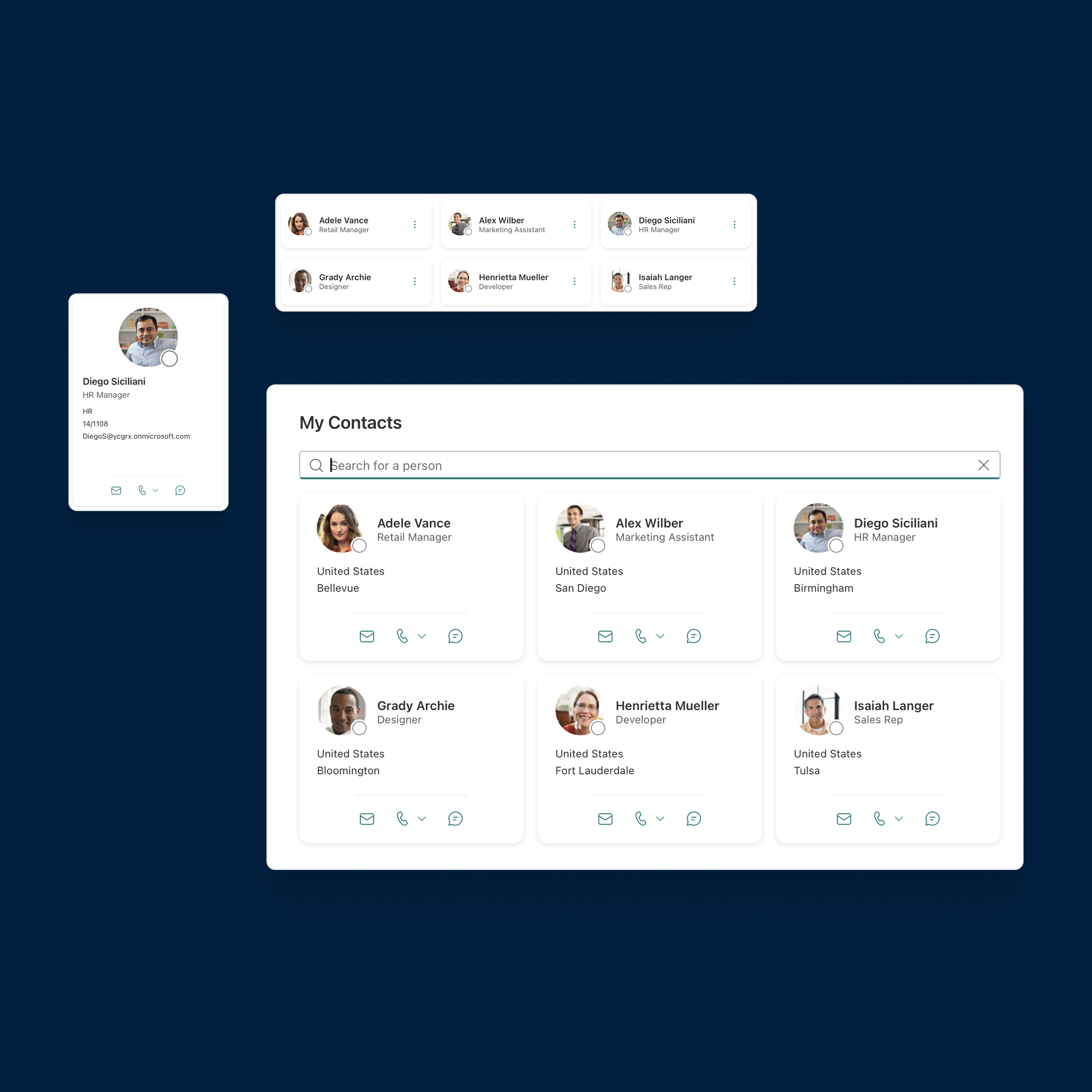 Enable direct actions like email, call, chat, or Microsoft Teams - so connecting takes seconds. Customize the action bar to suit the user’s needs and ensure a seamless experience when connecting across teams.